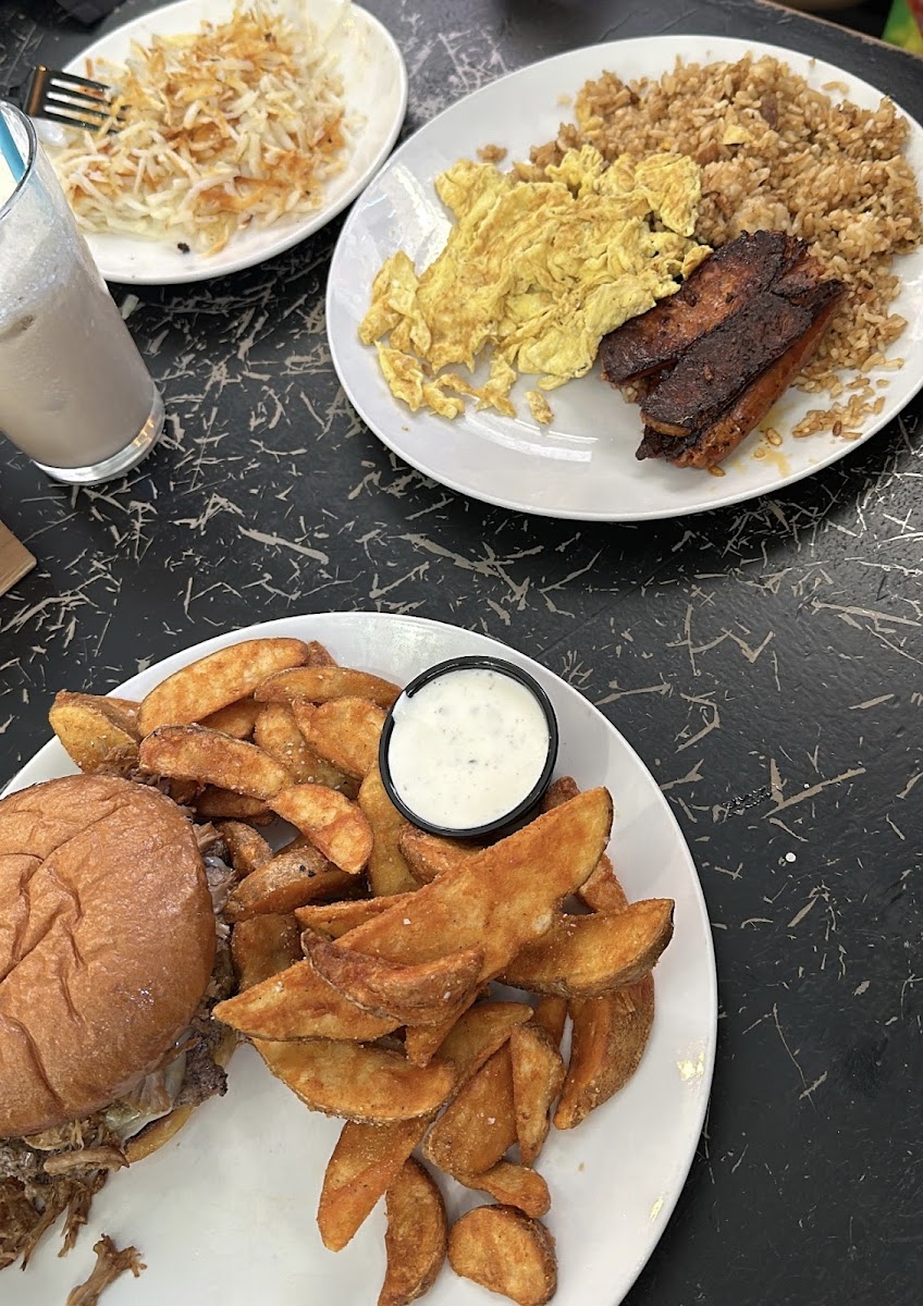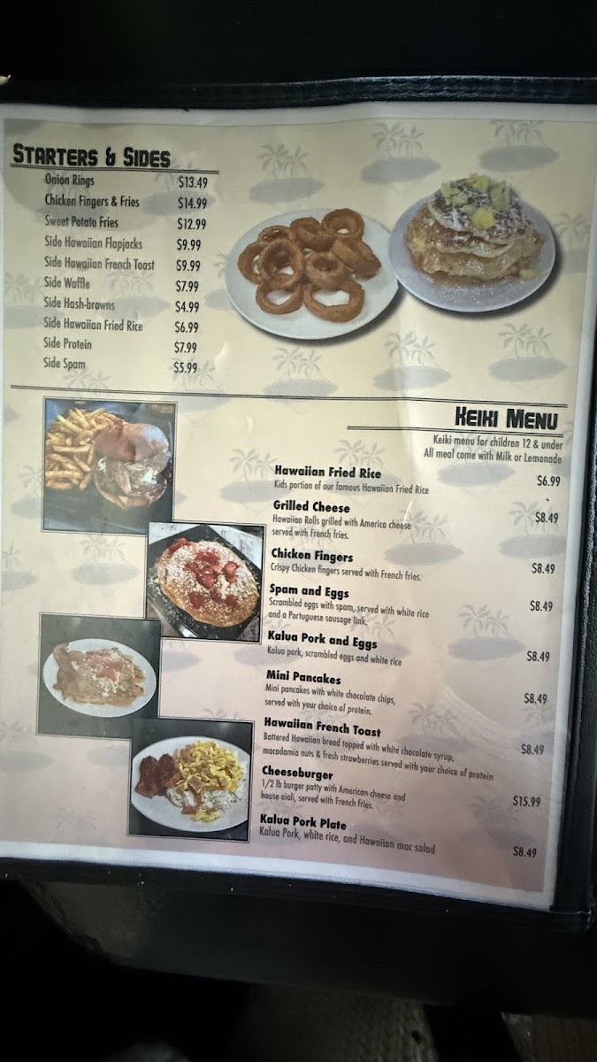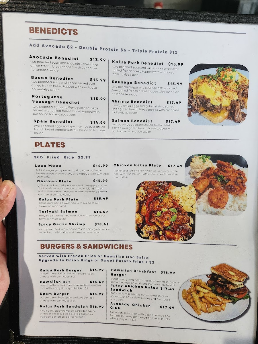As for the menu, it’s an enticing blend of traditional favorites and Hawaiian-inspired dishes. The Kids Menu offers delightful choices such as Kids Kalua Pork Plate, featuring tender kalua pork served with white rice and tantalizing mac salad, all for just $8.99. For brunch enthusiasts, the Benedict Brunch is a must-try. Indulge in the Salmon Benedict—two perfectly poached eggs atop toasted French bread, drizzled with a creamy lemon sauce, and paired with fresh salmon for an unforgettable taste sensation at $17.99. Early risers can also delight in the Bacon Eggs Benedict or the Portuguese Sausage Benedict, both showcasing the expertise and unique flair that this restaurant promises.