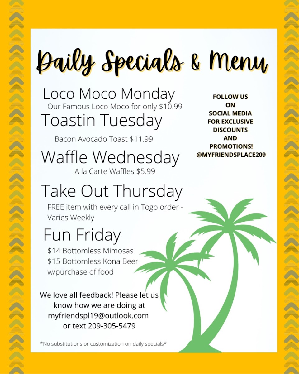 Welcome to My Friends Place, a charming eatery nestled in the heart of Manteca, CA. This delightful restaurant combines the warmth of a neighborhood diner with the vibrant flavors of Hawaiian and American cuisine. Whether you’re looking for a quick brunch getaway or a leisurely lunch, this is the perfect spot to satisfy your cravings while enjoying an inviting atmosphere.
