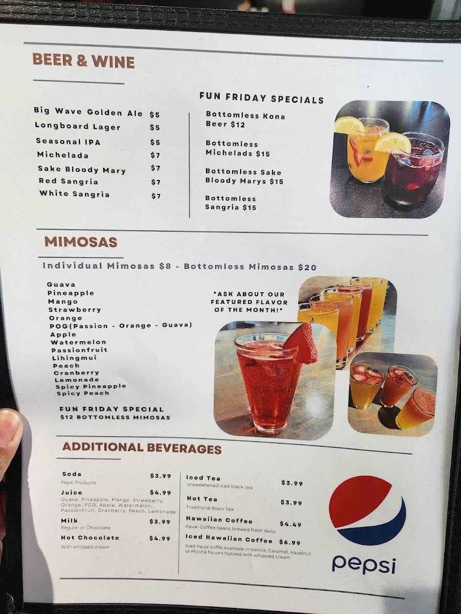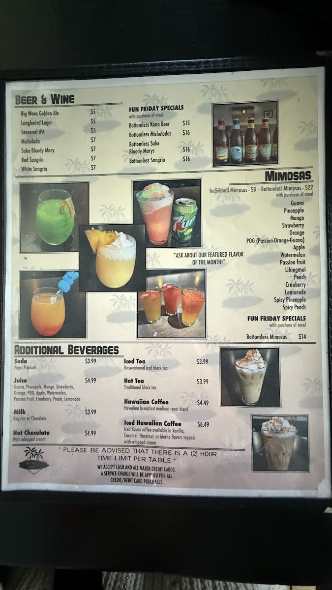Don’t miss out on the drinks; you can wash down your meal with a refreshing Pog Juice—a delightful mixture of passion fruit, orange, and guava that encapsulates the tropical essence of Hawaii, all for $3.99. Other beverage options like hot chocolate and freshly squeezed lemonade are sure to please both kids and adults alike.